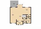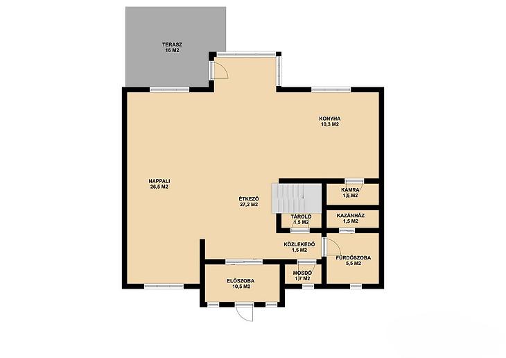 Földszint: amerikai konyhás nappali + étkező, zuhanyzós fürdőszoba, WC + mosdó, előszoba, kazánház, tároló, 16 m2-es terasz