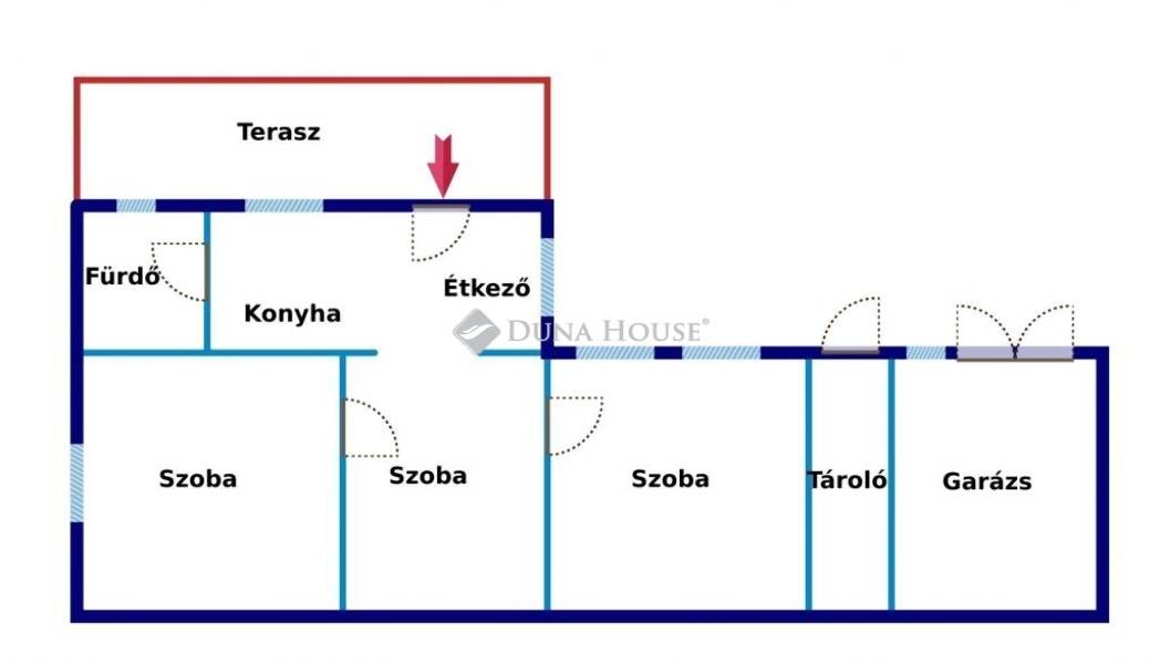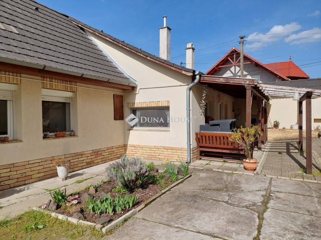 Az ingatlan áll ~ nappali, 2 szoba, fürdőszoba, konyha, garázs, tárolók, pince, fedett terasz.