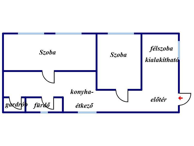 Helyiségei: 2 szoba, egy fél szoba még könnyen kialakítható, fürdőszoba, előtér, konyha-étkező, gardróbnak kialakítható helyiség.