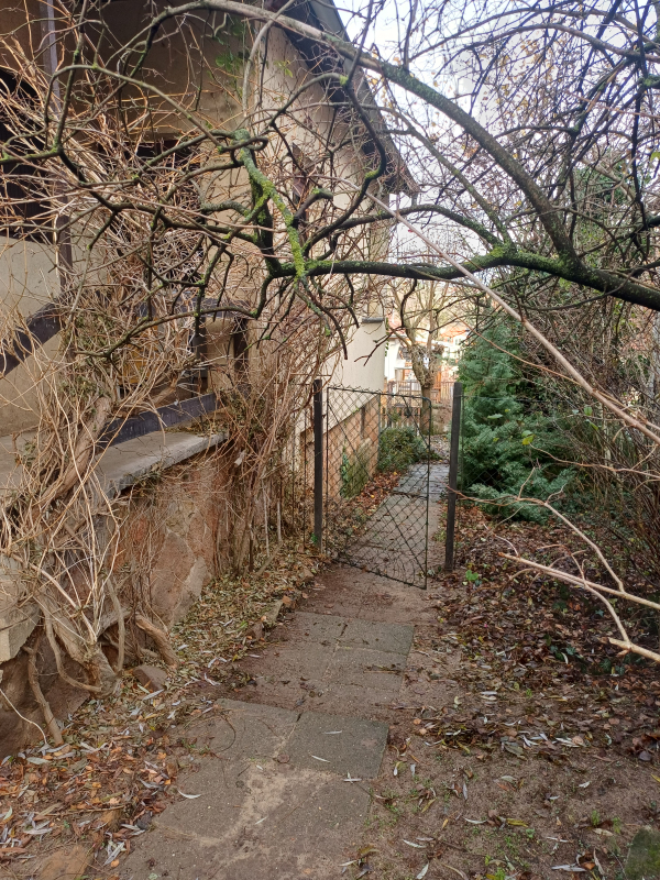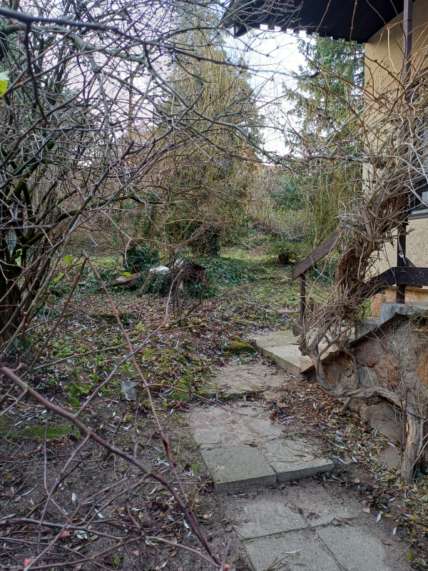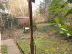 A hátsó kert hangulatos, intim, teraszos kialakítású, érett növényzettel rendelkezik.