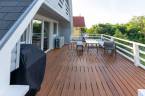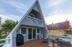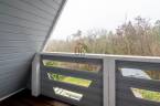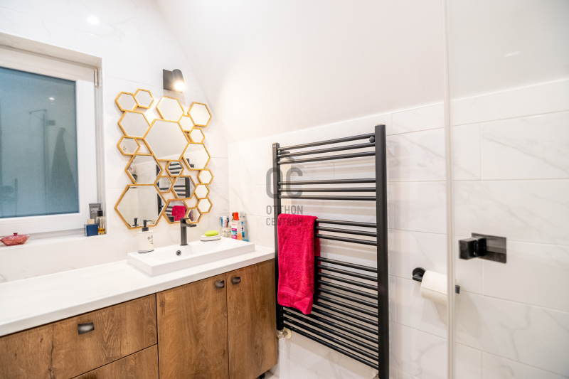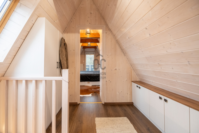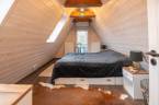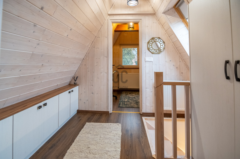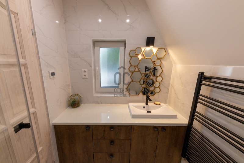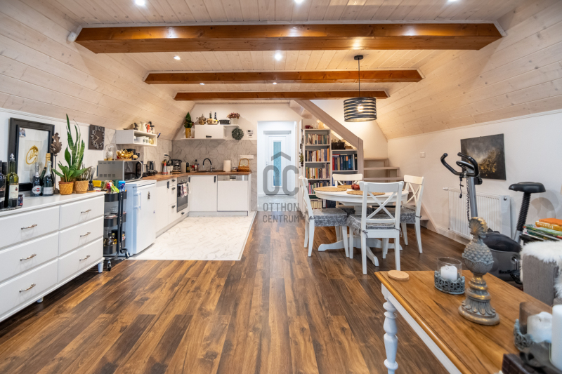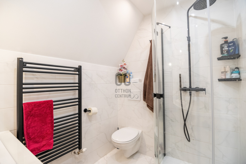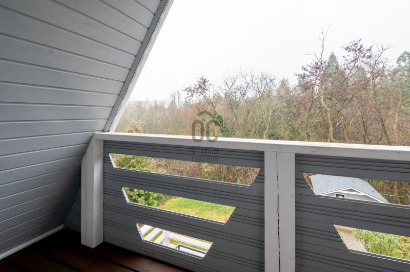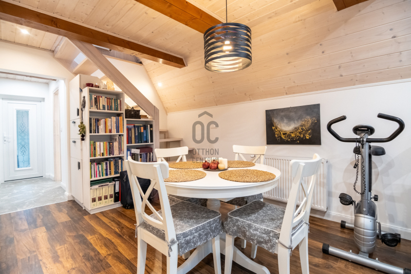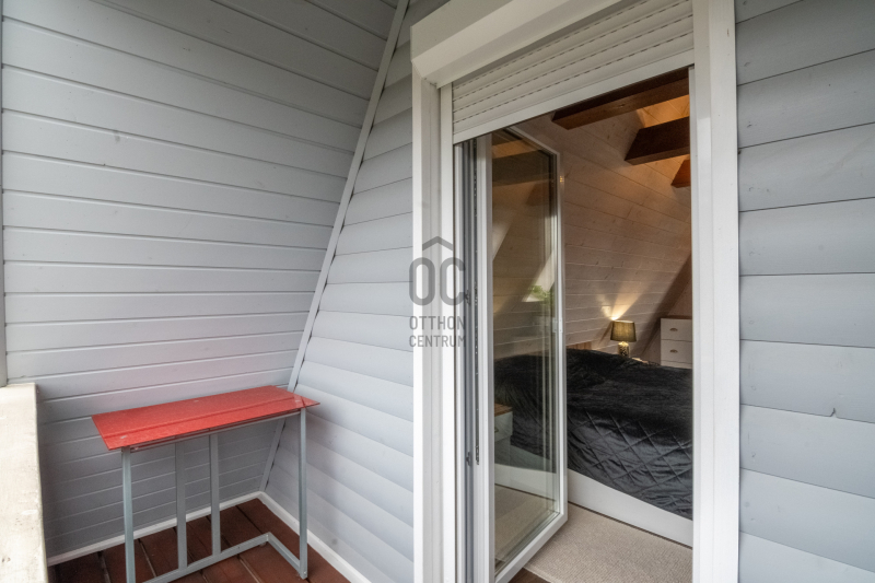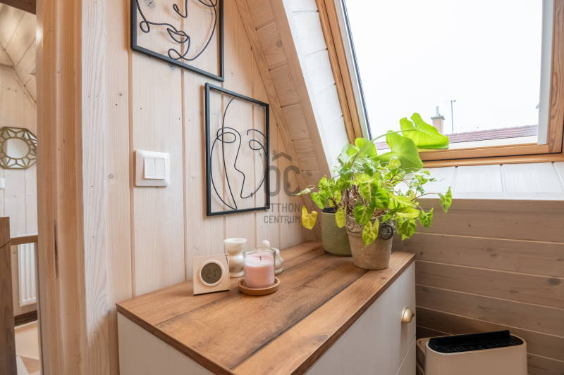 A szintet három nyitható Velux tetőablak teszi még világosabbá és jól szellőztethetővé. A felső szinten található a 4 m²-es, kertre néző loggia is.