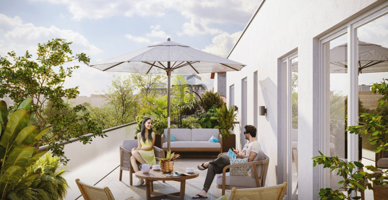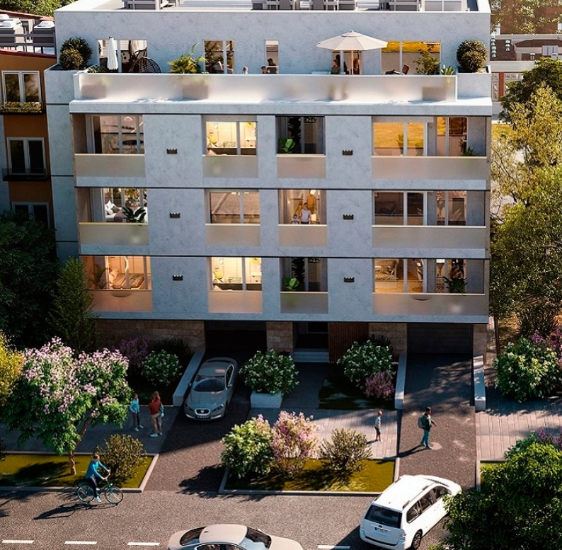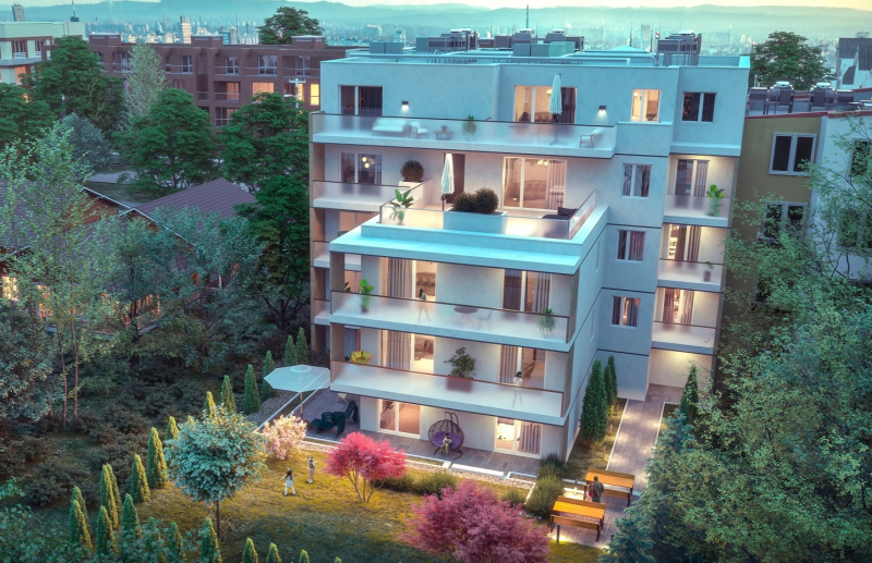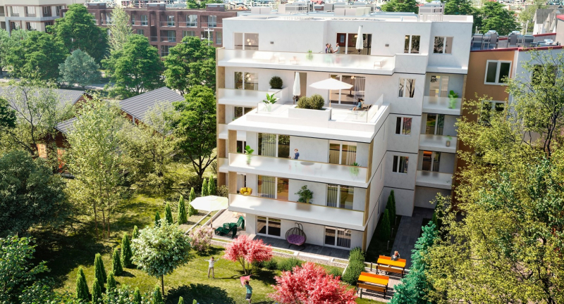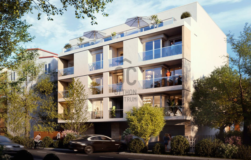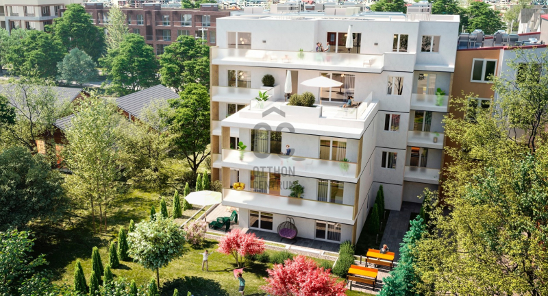 Épület: Jól átgondolt, remek beosztású, bájos, négyemeletes épület 18 lakással és 18 teremgarázshellyel (két parkolószinten). A saját terasz mellett a kert adottságait is élvezheted.