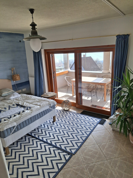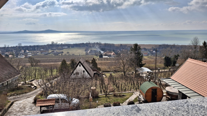 - az épület előtti bazaltkővel kirakott terasz jó időben tökéletes helyszín a pihenésre, és a szabadtéri étkezésre lenyűgöző panorámával a Balatonra és a környező településekre