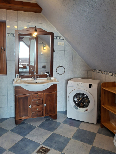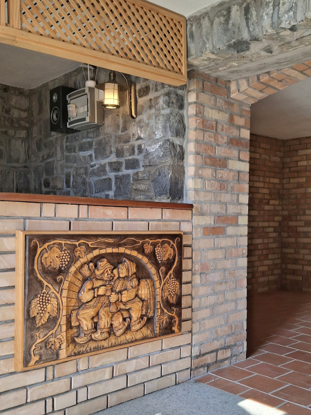 Az épület alatt fogadótérrel rendelkező pince biztosít helyet nagyobb baráti összejövetelekhez.