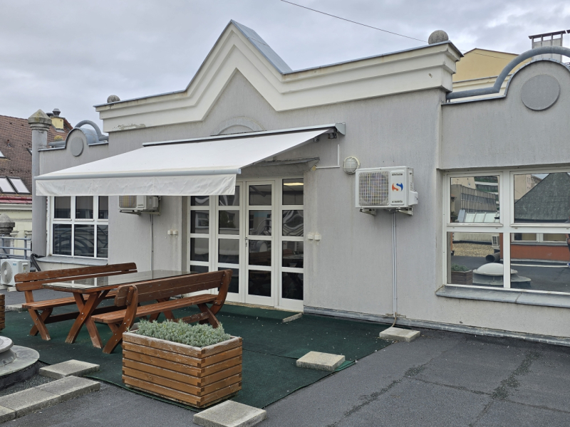 -200 m²-es, emeleti üzlethelyiség, hatalmas üvegportállal, tetőterasz használattal!