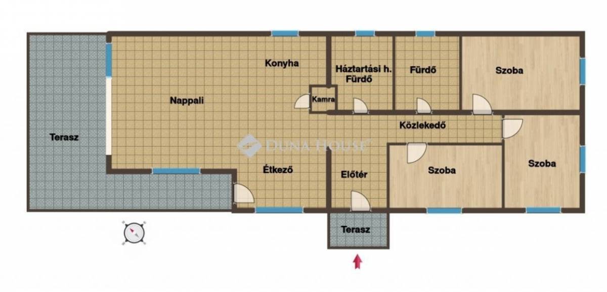 A családi élet színterét egy 51 nm-es amerikai konyhás nappali étkező biztosítja, privátszférát mindenki megtalálhatja a 3 külön nyíló hálószobában, a család kényelmét fokozza a 2 fürdőszoba, továbbá kamra, előtér, közlekedő is megtalálható a házban.