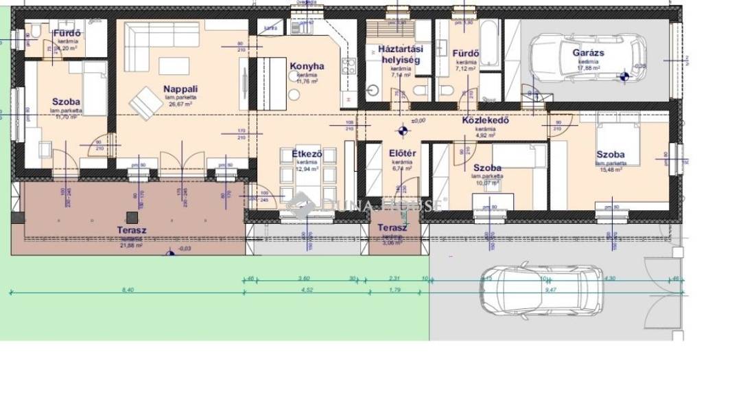 A lakótér 115 nm + 29 nm és 3 nm terasz, + gépkocsi beálló.
