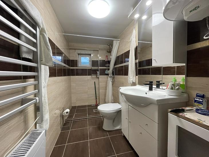 Elosztás: előszoba, konyha–étkező, nappali, zuhanyzós fürdő-WC, mosókonyha.