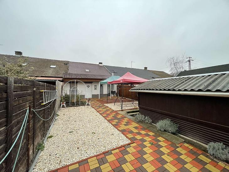 A házhoz 120 nm saját kert tartozik viakolor burkolattal, továbbá 18 nm-es garázs és kocsibeálló. A gáz telken belül, de az lakásban nincs bent.