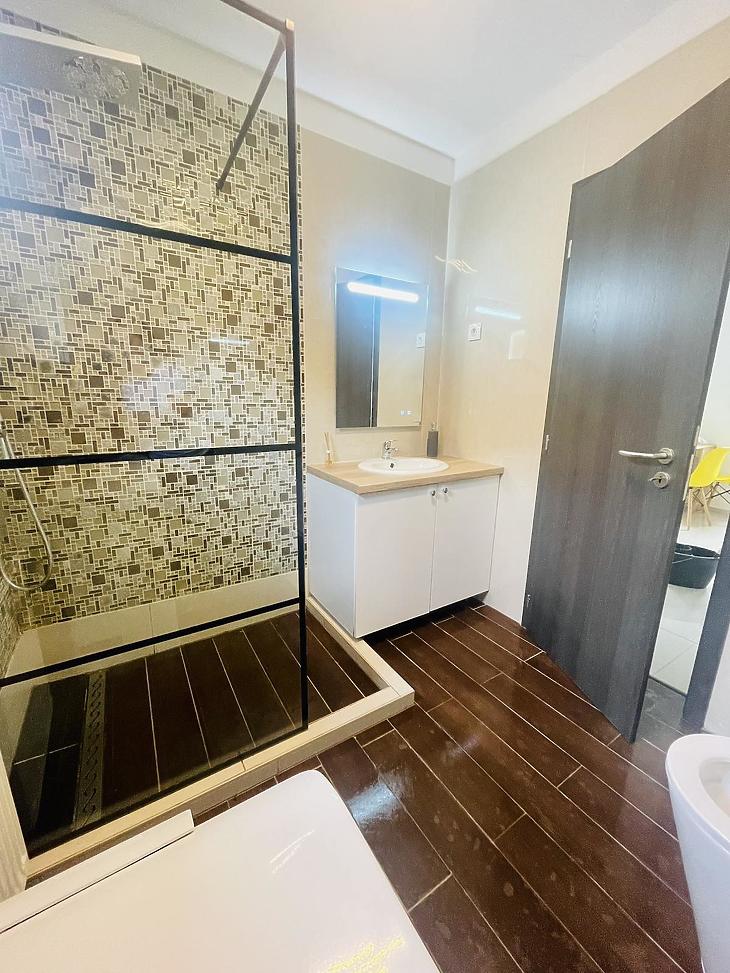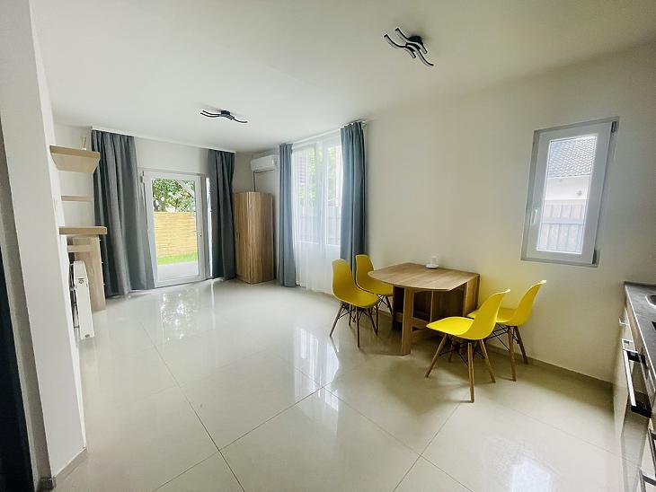 Az 54 nm-ben 1 nappali 1 hálószoba, fürdőszoba, WC, előszoba és étkezővel egybe nyitott konyha került kialakításra, illetve a nappaliból egy saját közel 20 nm-es kertbe tudunk kimenni.