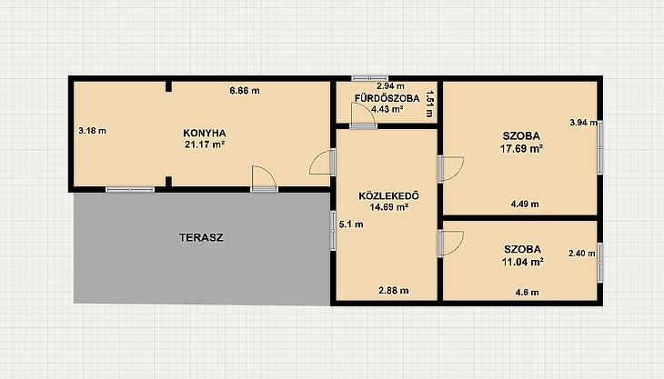 2 szoba, étkezős konyha, kádas fürdőszoba + mellékhelyiség, közlekedő, terasz.