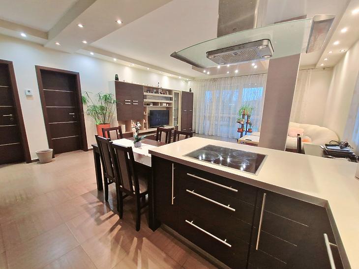 A burkolatok mindenhol jó állapotúak, minőségiek. A konyhabútor gépesítéssel együtt a vételár részét képezi.