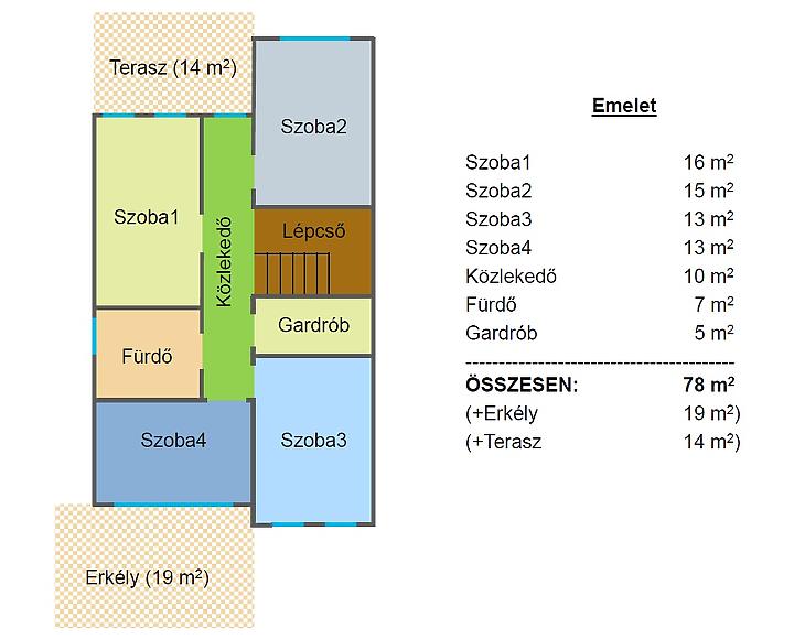 Az emeleten 4 külön nyíló szoba, fürdőszoba, gardrób és közlekedő biztosítja a kényelmes együttélést, minden családtagnak saját teret adva.