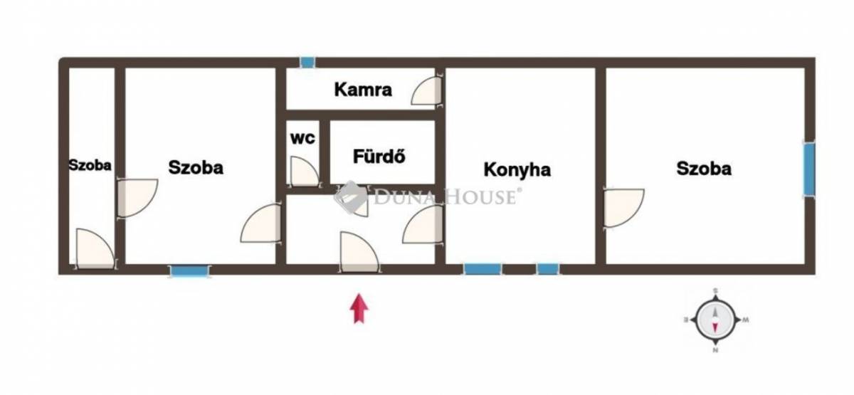 Lakótere: előszoba, 3 szoba, konyha, fürdőszoba wc-vel.