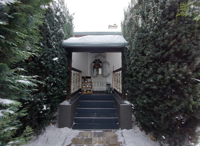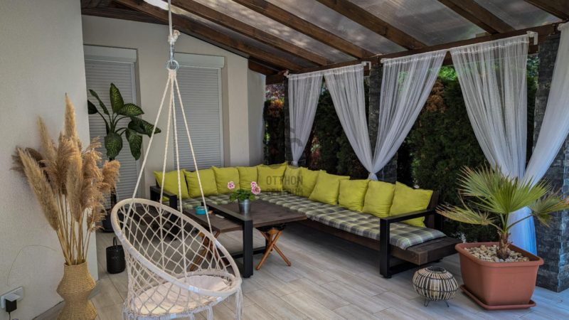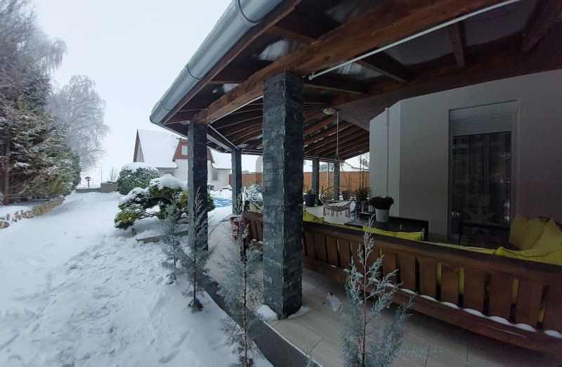 A kiváló állapotú lakóépület különleges, barátságos megjelenését a sokszögű kialakítás, az óriási fedett terasz és a nagyméretű nyílászárók teszik.