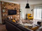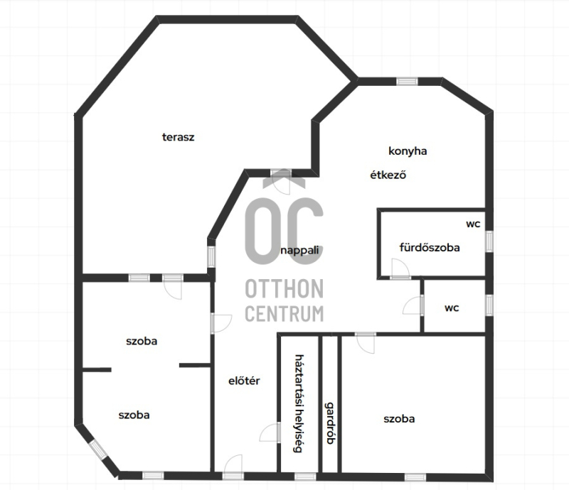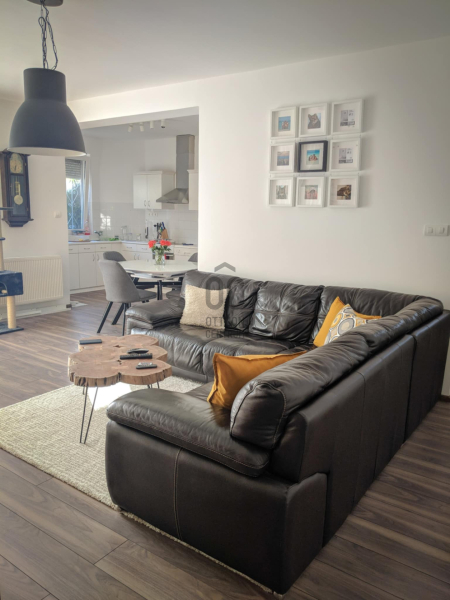 Előtér, háztartási helyiség, tágas, világos amerikai konyhás nappali, egy nagyobb szoba, ami 2 kis szobává alakítható, hálószoba gardróbbal, külön wc, és egy szép, felújított fürdőszoba-wc. A teraszra a nappaliból, és egy szobából is kiléphetünk. A nagy fedett terasz kiváló életteret biztosít a család, és vendégeik számára.