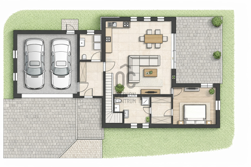 - Földszint: előtér, amerikai konyhás nappali étkezővel, hálószoba, gardrób, fürdőszoba, háztartási helyiség, garázs, terasz.