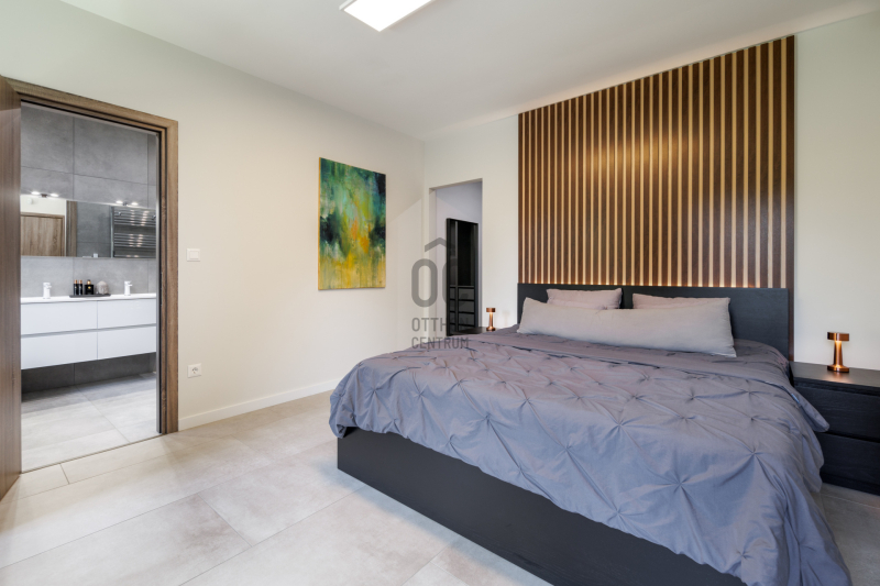 A fő hálószoba egy valódi luxus lakosztály, amely saját gardróbbal és elegáns, privát fürdőszobával rendelkezik, így maximális kényelmet és intimitást biztosít.