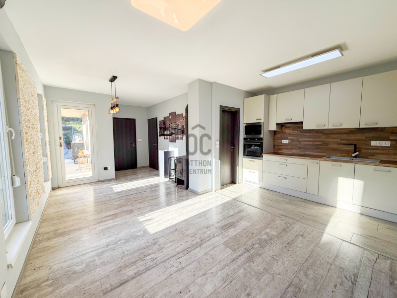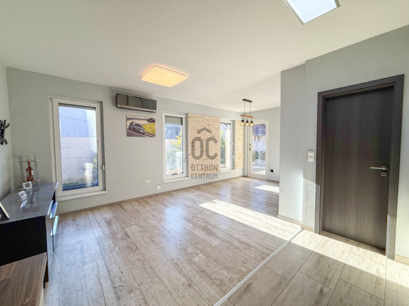 - Világos, nyitott nappali-étkező-konyha, nagy ablakokkal és közvetlen kertkapcsolattal.