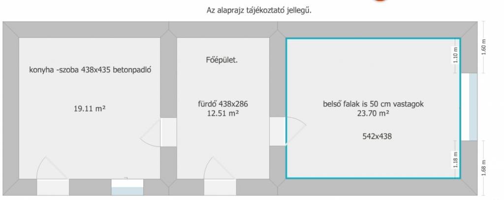 Mérete 56 nm és közvetlenül hozzá van építve egy 33 nm-es melléképület. A ház beltere rusztikus kinézetű fafödémes-gerendás szerkezetű, rendkívül hangulatos falusi házzá /vendégházzá renoválható.