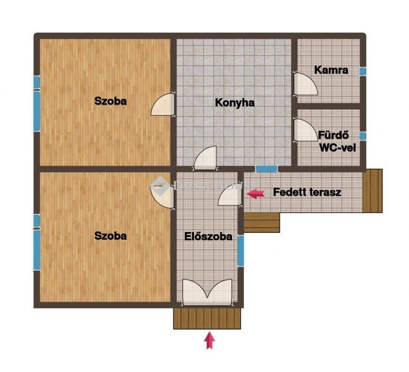 77 négyzetméteres lakótérben kialakításra került egy előszoba, 2 szoba (20,23 négyzetméter és 20,57 négyzetméter), egy konyha-étkező (17,77 négyzetméter), egy fürdőszoba wc-vel, valamint egy kamra.