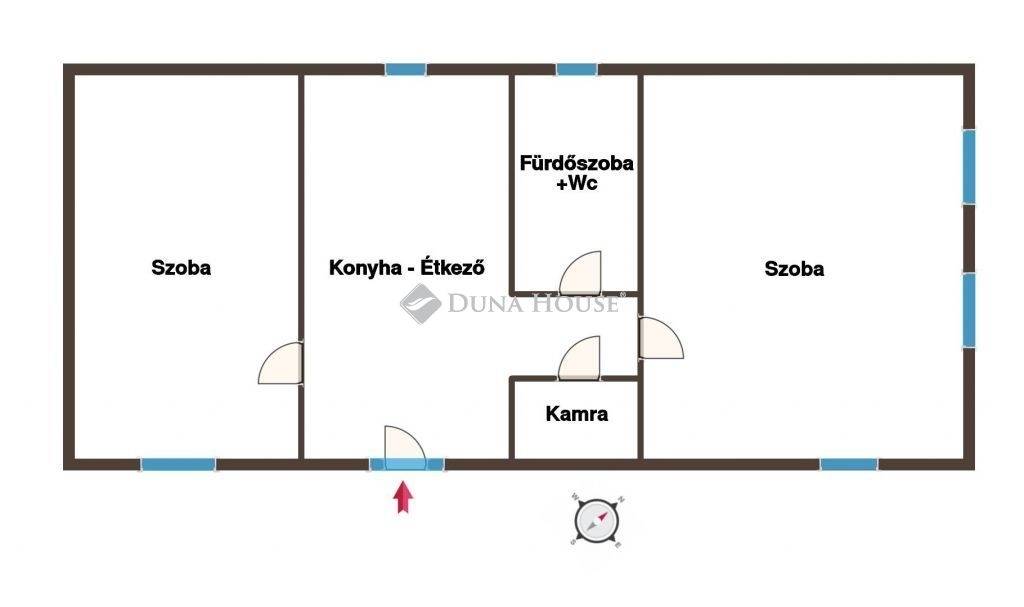 Az ingatlanban egy étkezős konyha, két különbejáratú szoba, egy fürdőszoba+wc, és egy közlekedő helyiségek kaptak helyet. Tárolás céljára egy kamra is rendelkezésre áll. Praktikus elrendezése okán optimális fiatalok, összeköltözők, idősek, kisebb családok számára is.