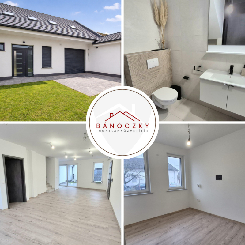 A földszinten a tágas, egybenyitott konyha–nappali–étkező a családi élet központja, amelyhez egy külön szoba, kamra és fürdőszoba kapcsolódik, valamint közvetlen átjárás nyílik a garázsból a lakótérbe. Az emeleten három hálószoba, gardrób, tároló és egy további fürdőszoba kapott helyet, így a ház ideális nagyobb család számára is. A szobák laminált burkolatot kaptak, a komfortérzetet hőszivattyús fűtés, klímák és kedvező H tarifa biztosítjanyilászárok 3 rétegűek.