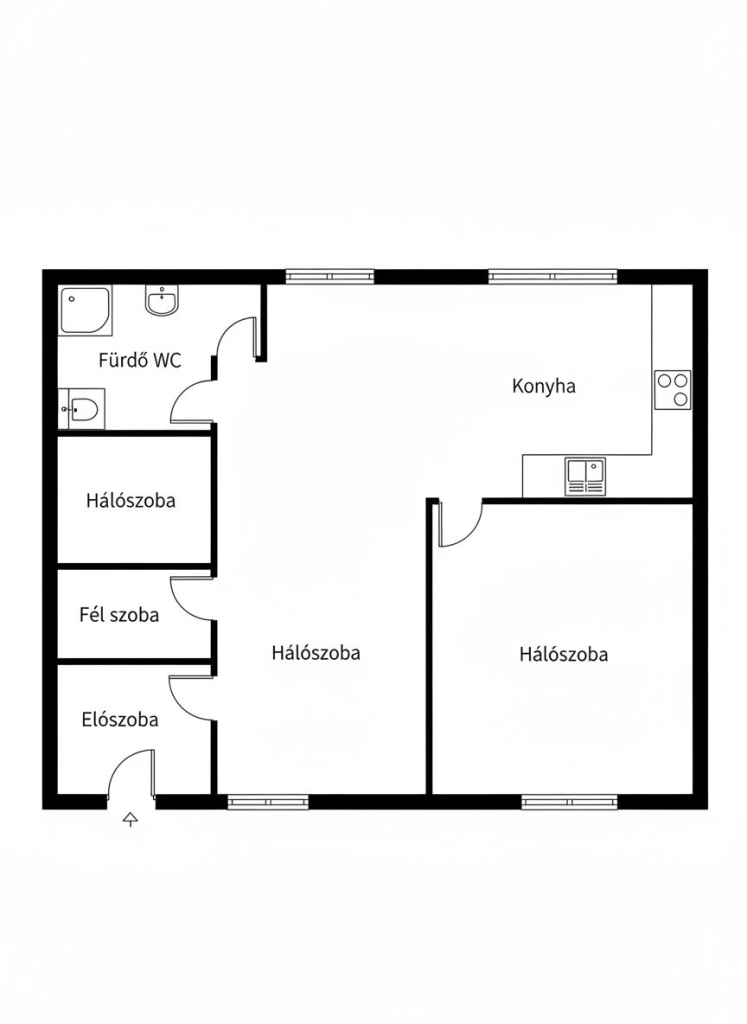 4 szoba (nappali + 2 félszoba + 2 szoba), világos, áttekinthető elosztás, ideális a családi élethez.