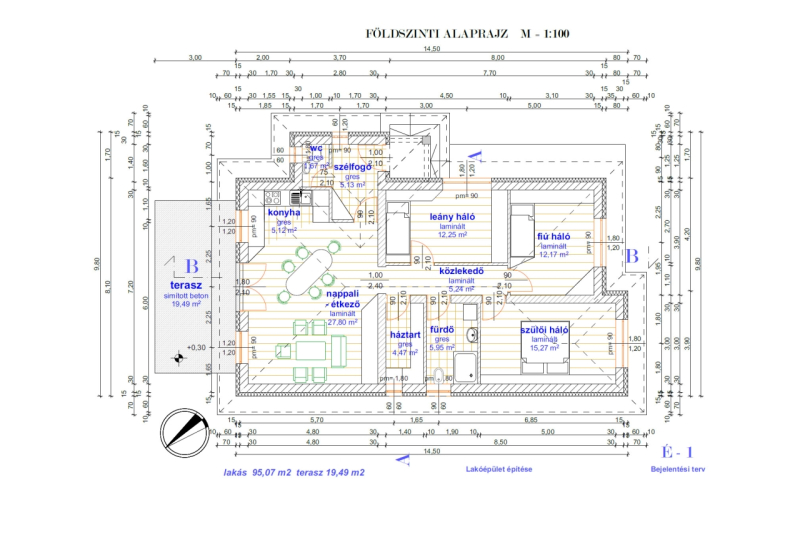 A tető héjazata antracit betoncserép lesz, a homlokzatok 12cm Austrotherm Grafitos EPS, a padló 10cm Austrotherm AT-N100-as, a vízszintes födém 25cm Ásványgyapot szigeteléssel lesz ellátva.