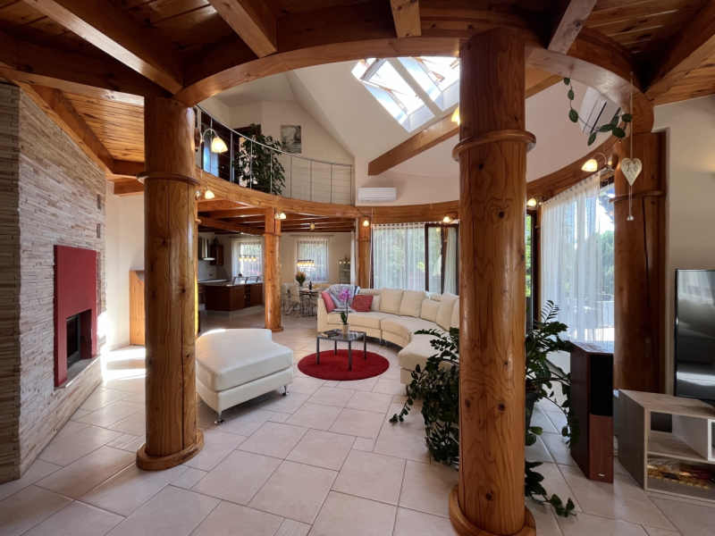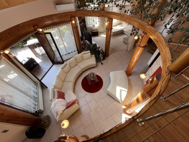 • 6 méteres belmagasságú, különleges kivitelezésű, galériás nappali, kandallóval