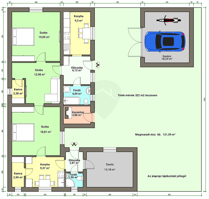 Egy téglából épült GARÁZS található az utcafronton, viszont jelenleg a kapu elhelyezkedése és a mérete miatt csak egy kisebb autó fér el, de könnyen átalakítható.