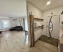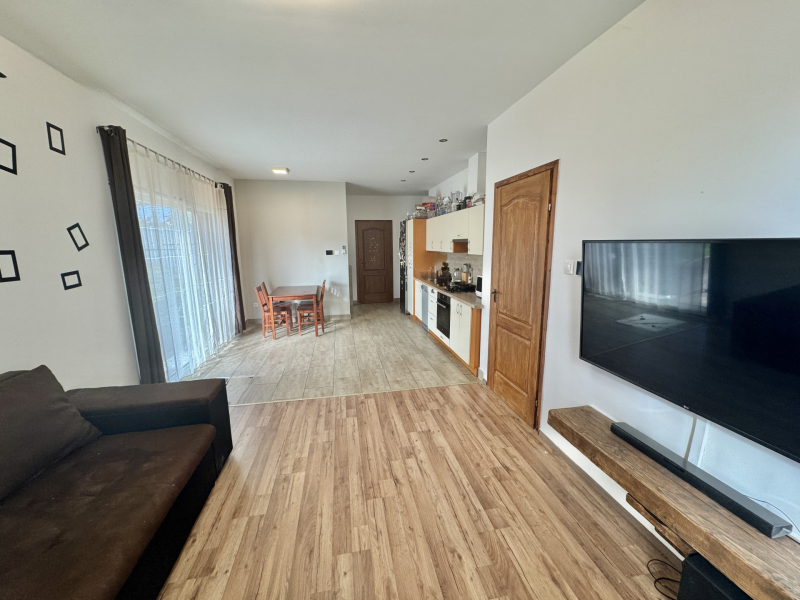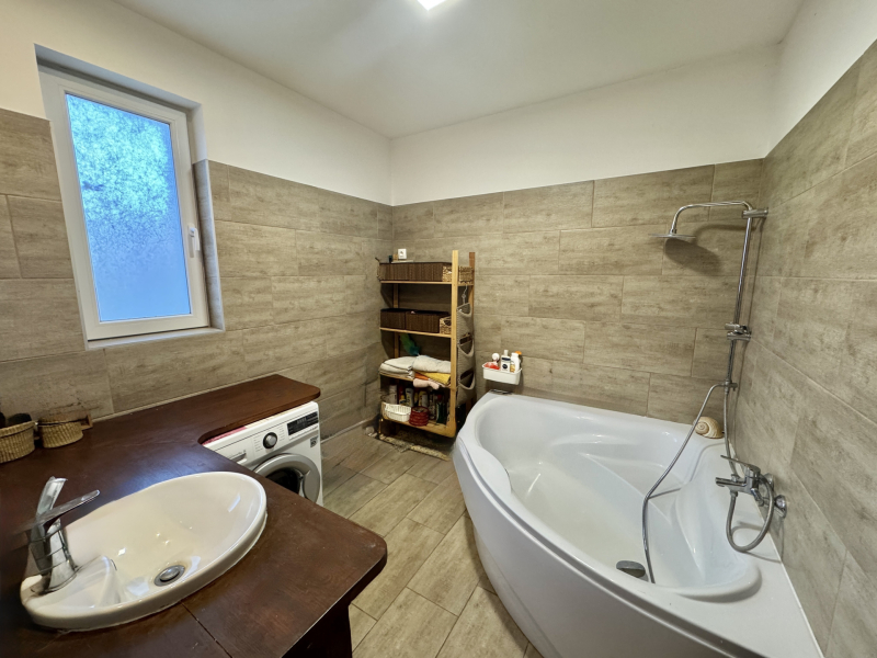 A fürdőszobában sarokkád található, a WC külön helyiségben kapott helyet. Az amerikai konyhás nappali tágas és világos, ideális központi életteret nyújt a család számára.