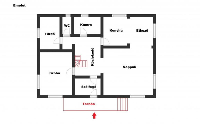- elosztása: nappali + konyha + étkező, 1 szoba, szélfogó, fürdő, WC, kamra, közlekedő