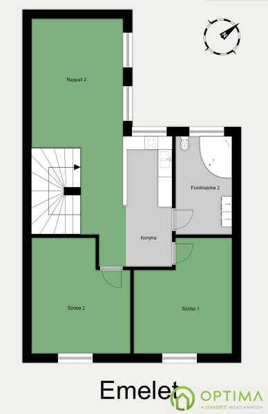 Az emeleten egy amerikai konyhás nappali, két hálószoba és egy fürdőszoba található.