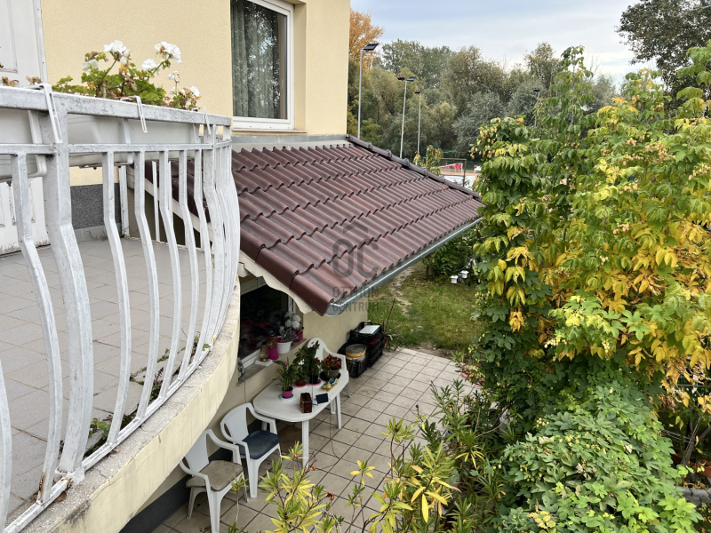 Az egyik lakás az alsó szinten helyezkedik el, nettó 64nm-es, a bejárata a Duna part felőli kapun át a kerten keresztül közelíthető meg, 24nm-es terasszal, plusz egy 12 nm-es kazán és tároló helyiséggel rendelkezik. Itt található két külön bejáratú szoba, konyha étkezővel és egy tágas fürdőszoba hidromasszázs káddal, külön álló szaunával, mely wellness érzést biztosít.