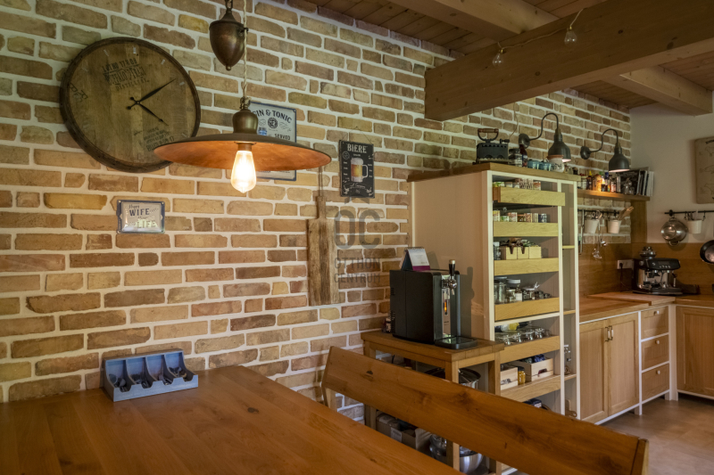 -Bontott tégla fal és egyedi hangulatvilágítás (Olaszországból és Angliából rendelt lámpák)