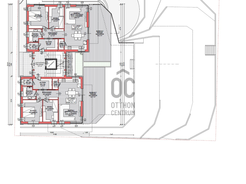 1. lakás :70nm,nappali+2 háló, +35.3nm-es terasz,