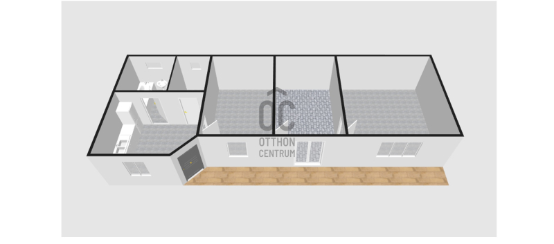 Az utcáról az udvaron át megközelíthető házba, a kis fedett teraszról léphetünk, a konyha-étkezőbe, melyből a mosdó, a spejz, és egymást követően a szobák érhetők el.