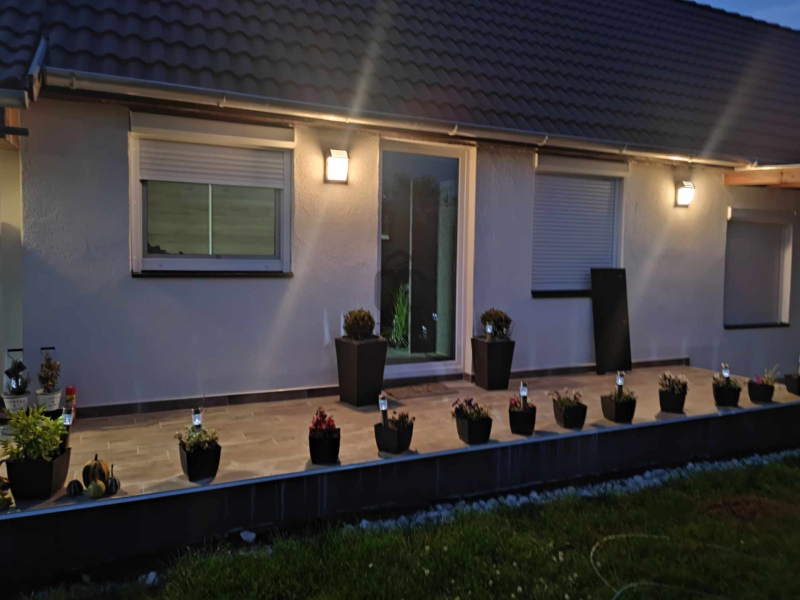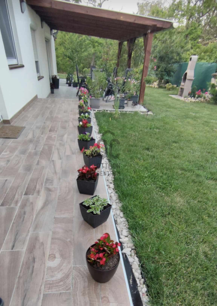 A telken elhelyezkedik egy 24m2-es garázs, tárolók, térköves kocsibeálló és egy gyönyörű járólapos terasz.
