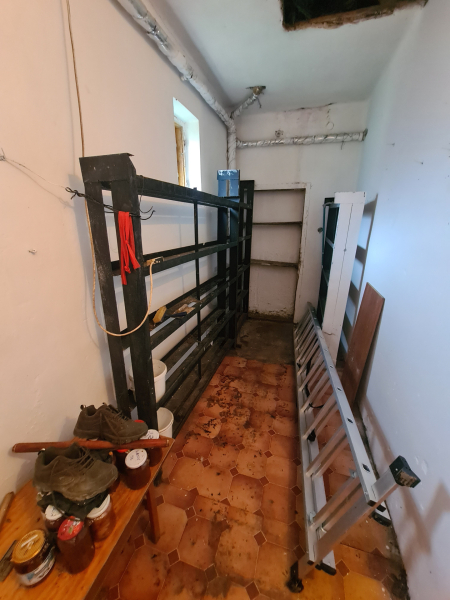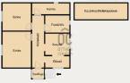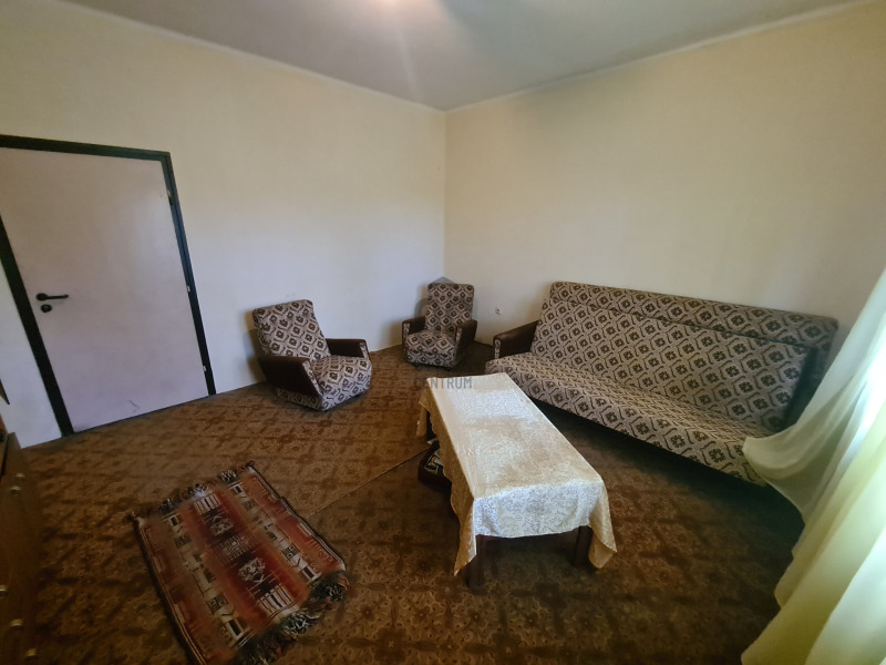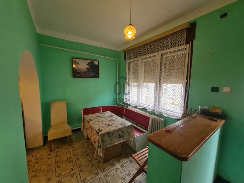 A ház elosztása: két kényelmes szoba, közlekedő, kamra, fürdőszoba-WC egyben, konyha, étkező, és egy szélfogó rész.