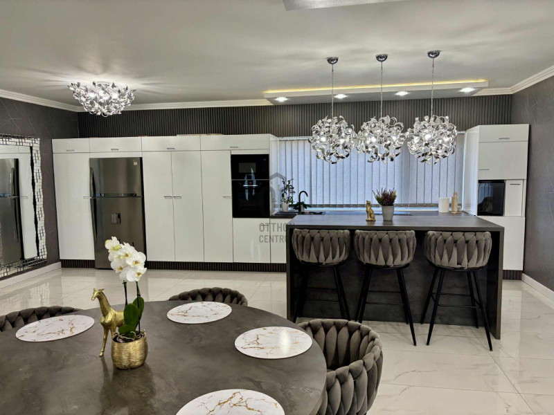 A tágas, közel 50 m²-es amerikai konyhás nappali-étkező az otthon központja, ahol bőséges természetes fény és nyitott tér fogad.