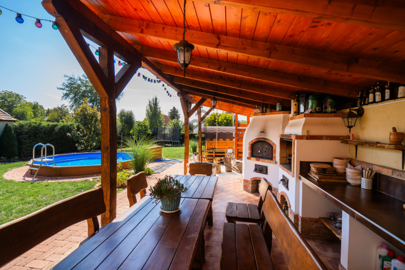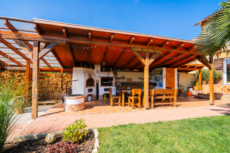 - 30 m² fedett grillterasz konyhával, kemencével, bográcsozóval és külön WC-vel