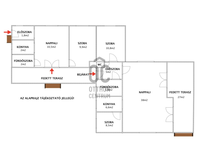 Brutto:30 nm + terasz 12 nm /2 (= 6 ) = 36 nm 2 szoba