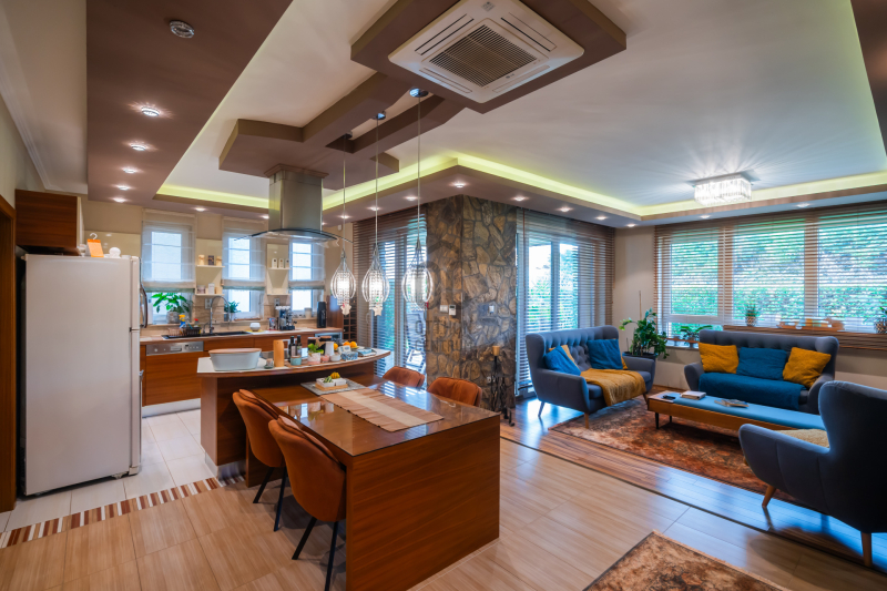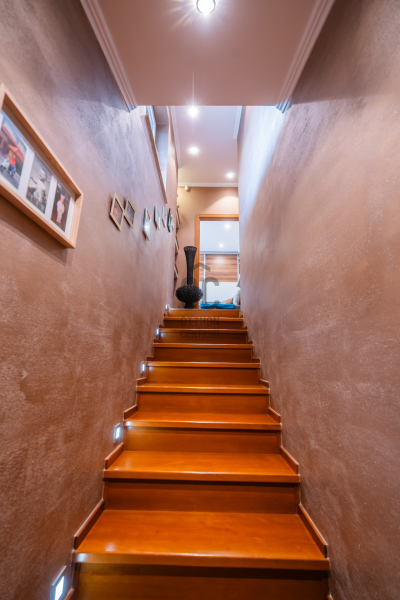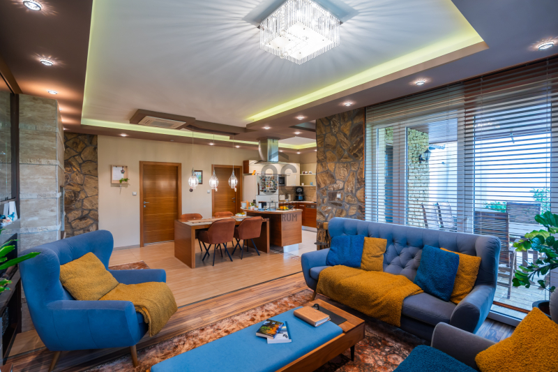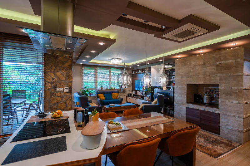A tágas, napfényben úszó nappali, a meleg tónusú belső terek, a kézzel készített beépített bútorok, valamint az egyedi világítástechnika együttese elegáns, mégis otthonos hangulatot teremt.
