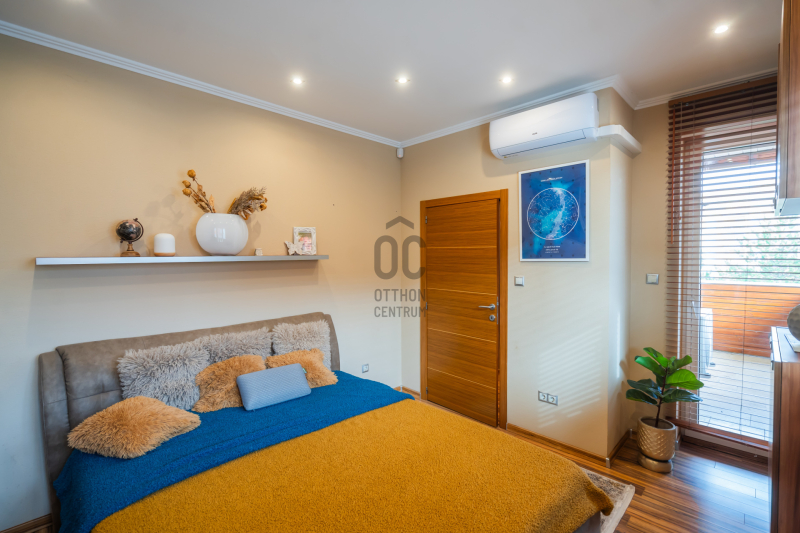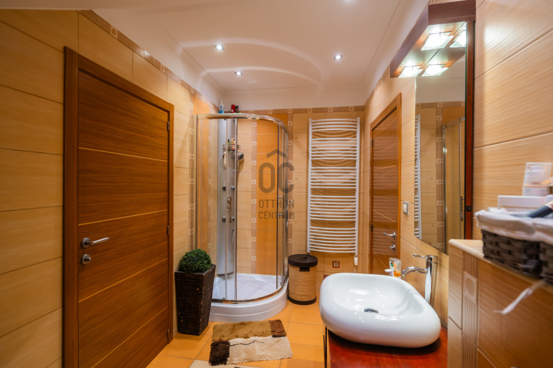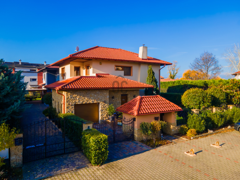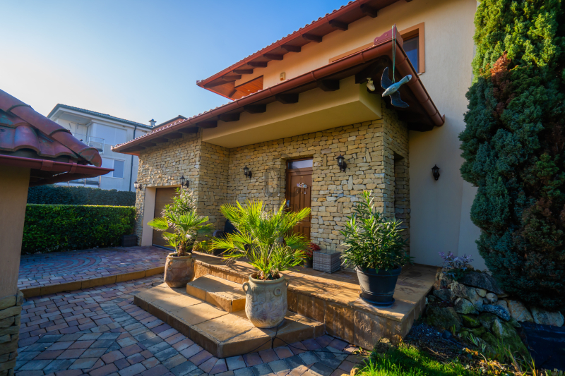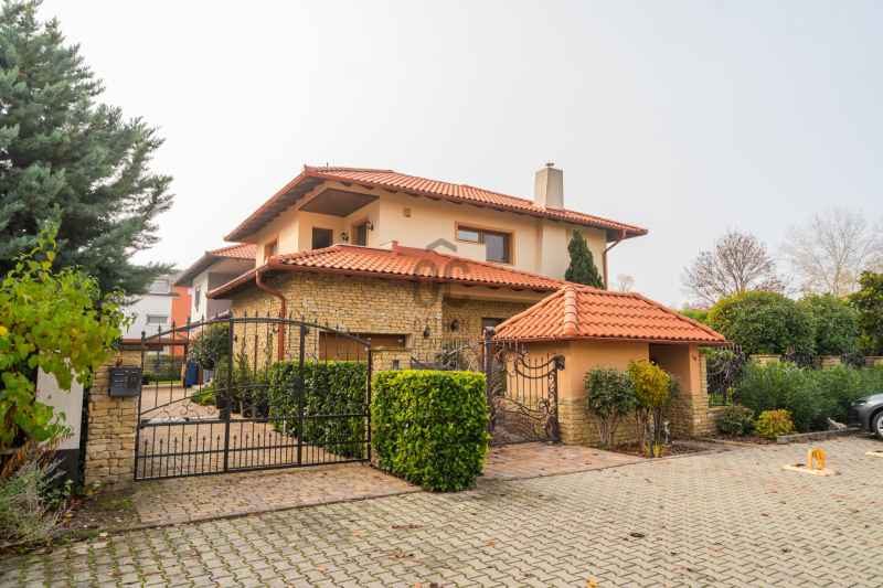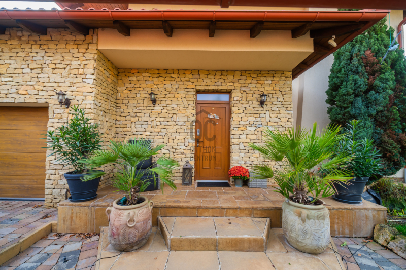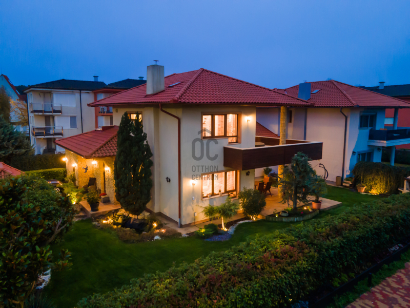 Az épület homlokzatát ürömi kő borítja, a kertet automata öntözőrendszer és alkonykapcsolós világítás teszi tökéletessé.