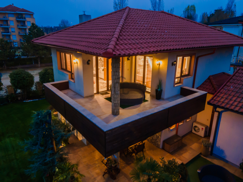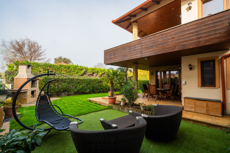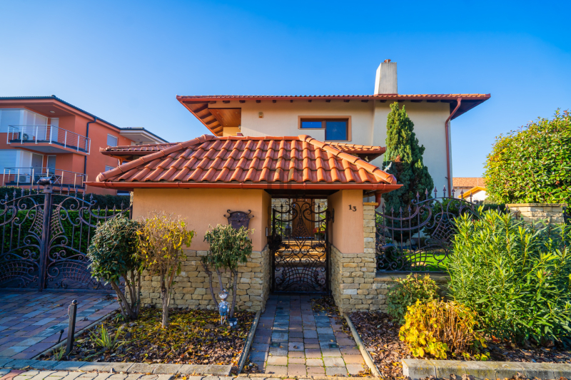 A 500 m²-es privát telekrész harmonikusan kapcsolódik a ház stílusához, kovácsoltvas kerítése és gondosan válogatott növényei egy valódi mediterrán kert hangulatát idézik.