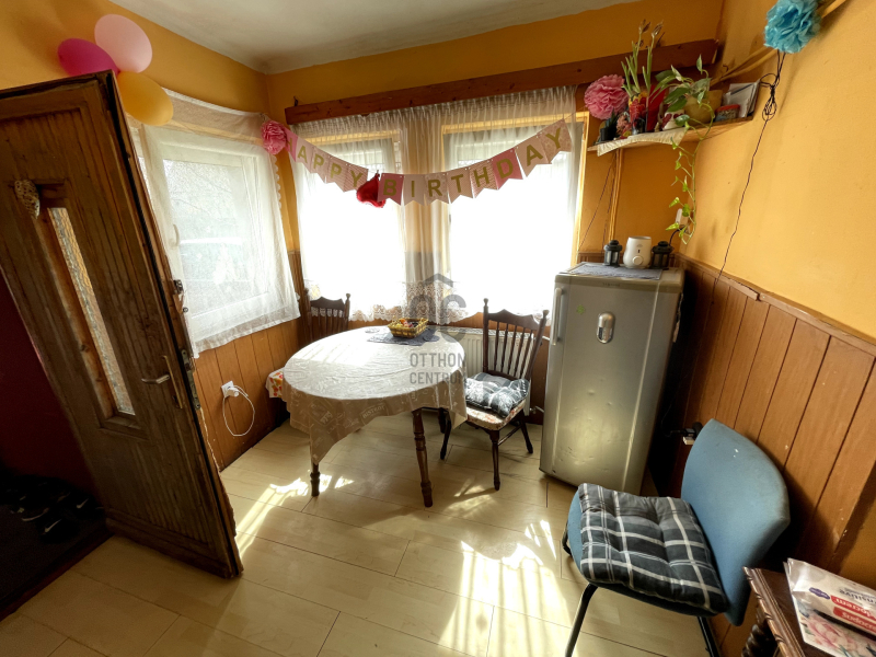 A házba érve egy előszobába érkezünk, majd egy tágas étkezőbe, ezután találjuk a konyhát, 2 nagy szobát, fürdőszobát és egy kamrát is.