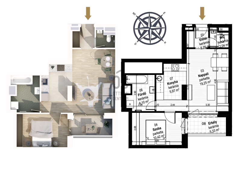 - 1. emeleti, nettó 47,77 m²-es lakótérrel és 5,33 m2-es, délkelti tájolású, fedett erkéllyel rendelkező, modern ingatlan.
