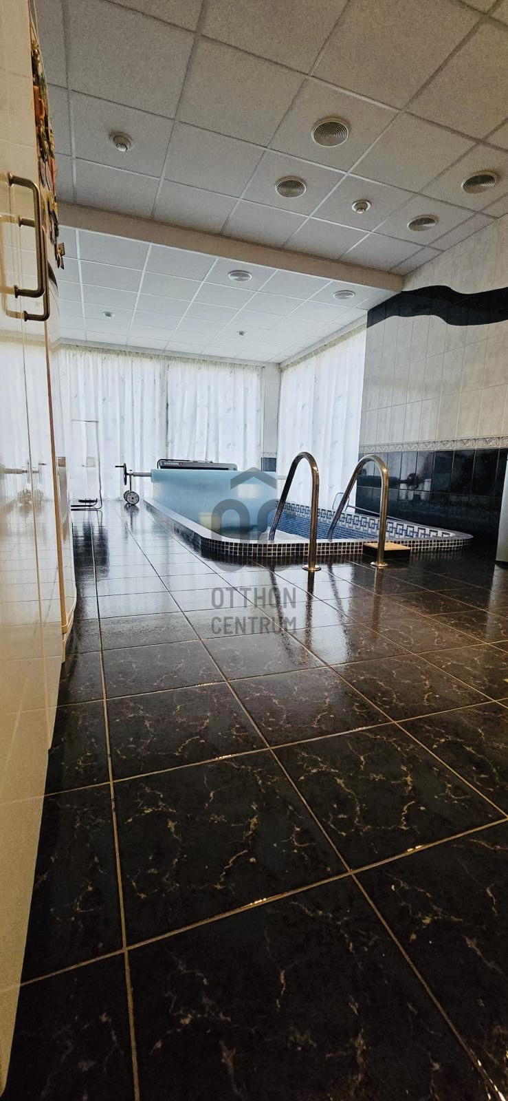 A földszinten található wellnessrészleg a ház igazi különlegessége: nagyméretű beltéri medence, orosz szauna, zuhanyzó és mosókonyha gondoskodik a feltöltődésről. Innen is kijuthatunk a teraszra, így a nyári pihenés igazi élménnyé válik.