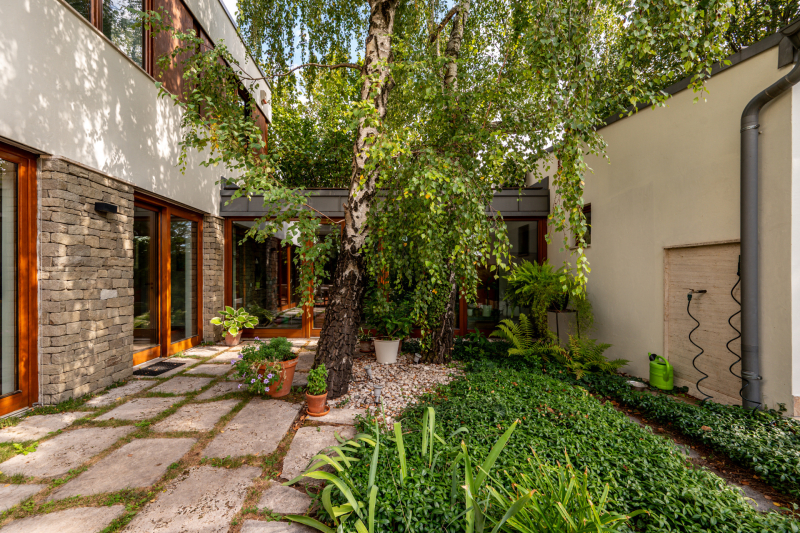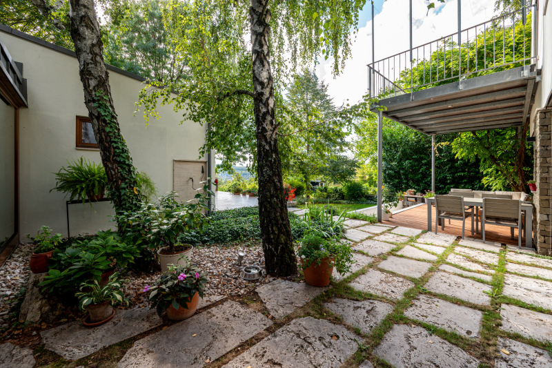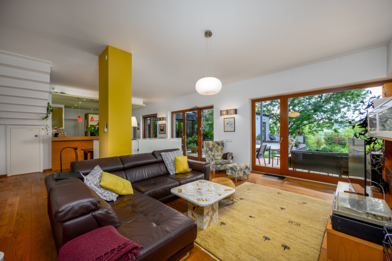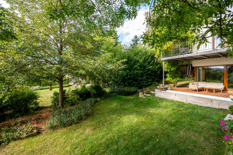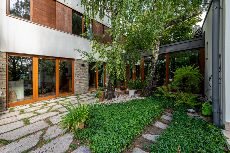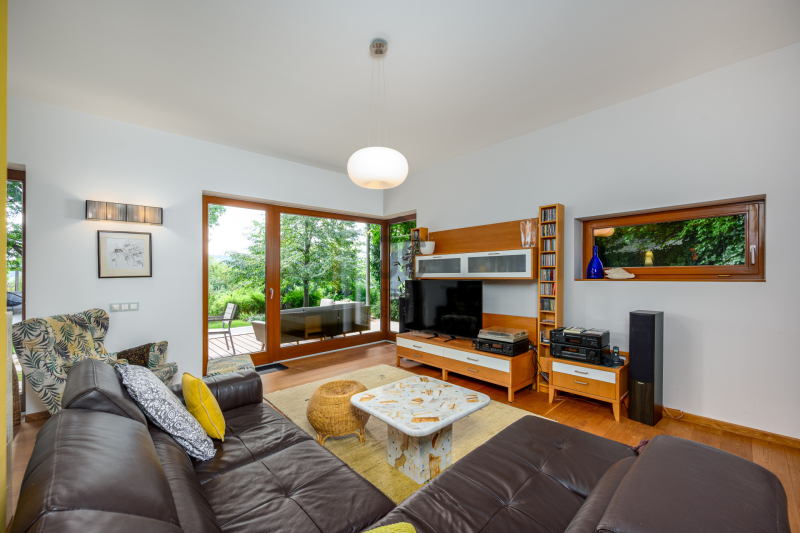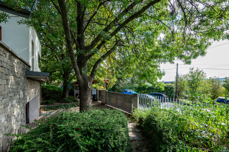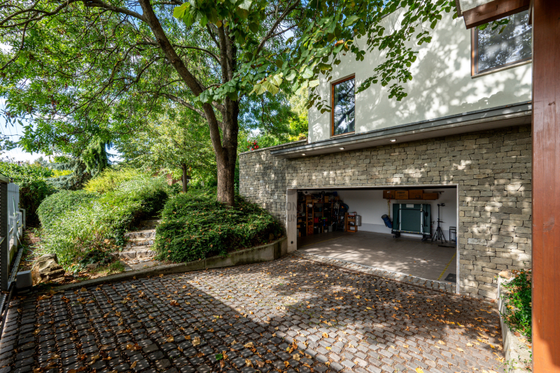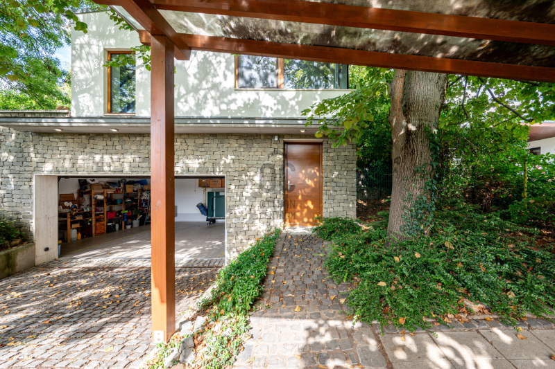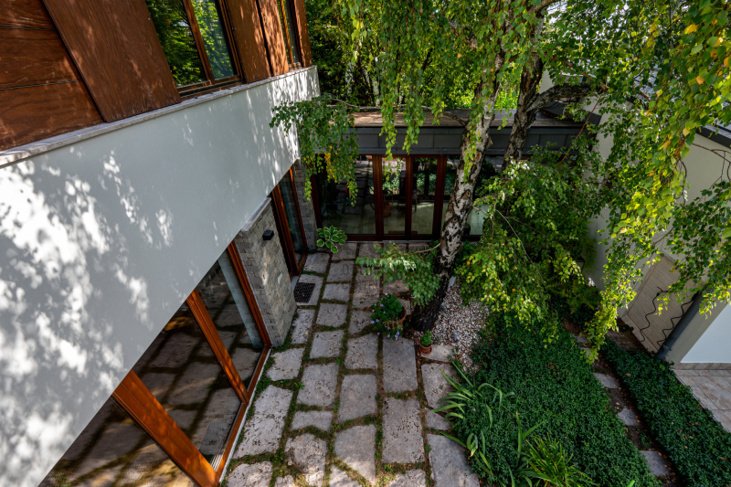 Nagykovácsi Cseresznyés részén áll ez a ház, melynek tervezésekor az volt a fő szempont, hogy a meglévő fák megmaradjanak – a végeredmény egy építészeti remekmű, ami körbeöleli az élő természetet. A fák árnyéka természetes hűtést és páratlan atmoszférát biztosít. A lehető legtöbb helyen hatalmas üvegfelületek engedik be a fényt és szinte elmossák a bel- és kültér közötti határokat. A ház egyik különleges építészeti megoldása a télikert, amely olyan érzetet nyújt, mintha közvetlenül a kertben sétálnánk.